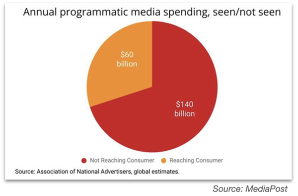 – Unless something dramatic happens, online programmatic advertising is writing its own obituary. Advertisers are being abused blind by adtech ferrets. Research from Media Post concludes that out of the US$200 billion global spend, 70% of advertising dollars spent on online programmatic advertising never touch a human being. In effect, $140 billion disappears in “ad fees, fraud, non-viewable impressions, non-brand-safe placements, and unknown allocations” (by “unknown allocations” you can read “shit that no one can figure out”).