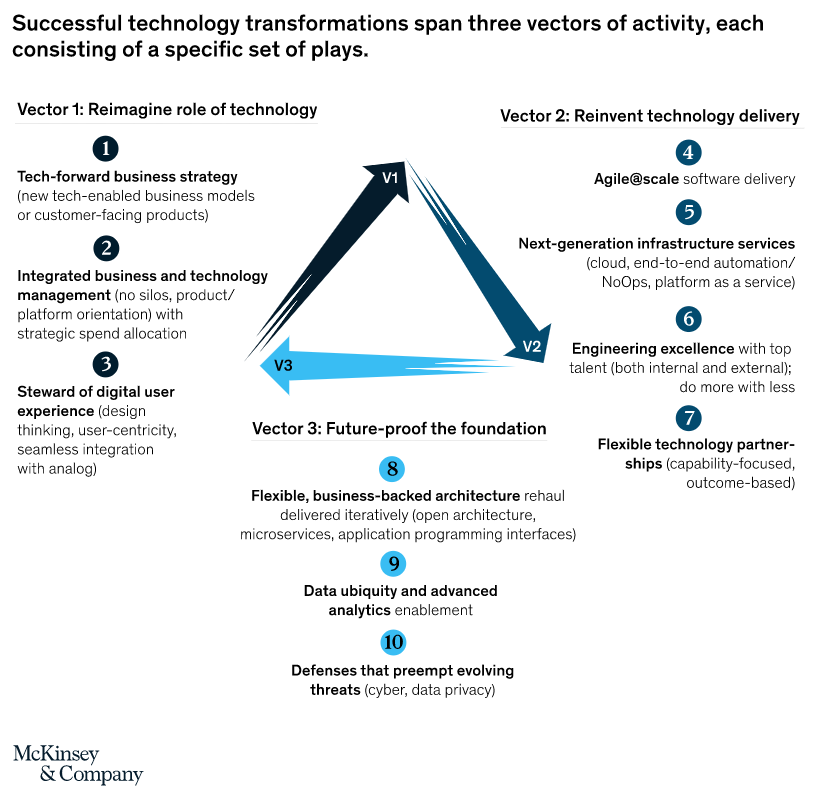 Detailed conversations with CIOs as well as our own experience helping businesses execute complex technology transformations yielded a broad array of insights, best practices, and guidelines. We’ve synthesized them into a “tech forward” model that highlights three interconnected vectors, within which are ten specific “plays,” or domains of activity (Exhibit 2).