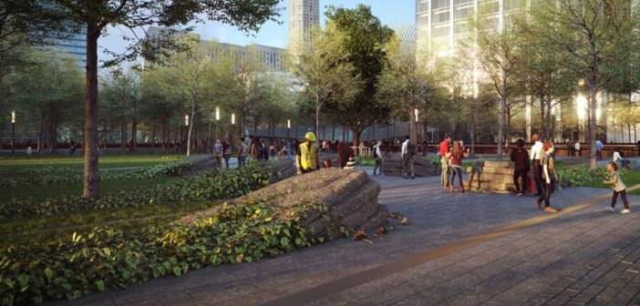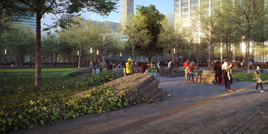 What will it be like to experience this new memorial? If you’re approaching from the southwestern side of the plaza, the path will be a serene entry point into the larger memorial. The path will cut through a grassy glade, with the same swamp white oak trees that cover the rest of the plaza guarding its periphery. If you look up, you’ll be able to see 1 World Trade Center, presiding over the plaza like another kind of memorial–one to the necessity of moving forward. As you walk, the immense granite boulders with the inlaid steel will rise out of the earth, reaching perhaps to your waist. The Survivor Tree will wait on the other side.