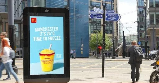 For example, in 2019, McDonald’s ran a digital out of home campaign that reacts to the weather. Launched all over the UK, the ad showcased different products based on the weather in the area, and the creative changed based on the temperature. For instance, when temperatures were over 25 degrees Celsius, the campaign updated its imagery. It also contained live temperature updates and the city name.